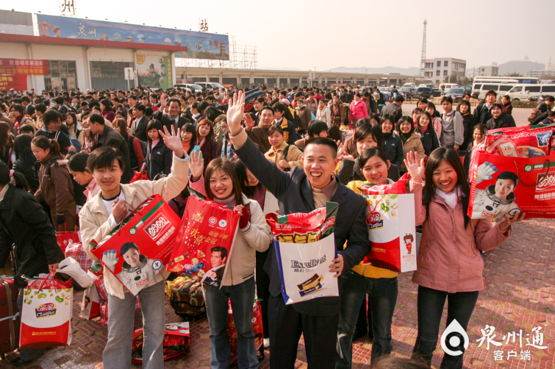 2005年春节前,搭乘返乡专列的湖北籍员工收获大礼包,在当时的泉州火车东站准备启程出发。