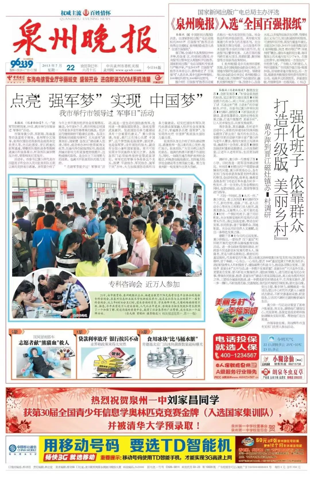 ● 7月20日,由国家新闻出版广电总局组织的2013年“百强报刊”推荐活动结果揭晓,《泉州晚报》成功入选“全国百强报纸”,是全国地市级晚报唯一的一家。