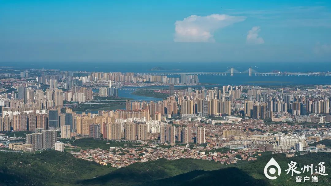2022年8月初,从紫帽山凌霄塔观景台眺望泉州湾,晋江母亲河下游两岸的城市发展面貌尽收眼底。(陈起拓 摄)