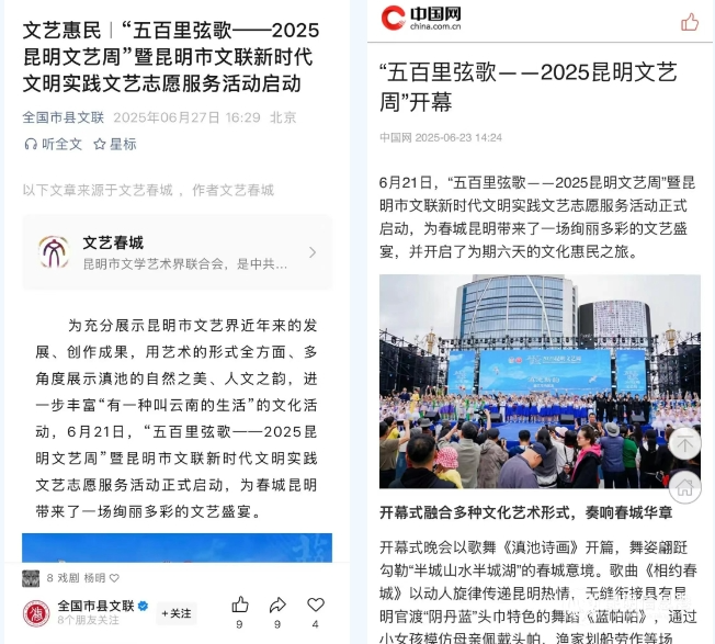 活动期间,共开展了三次直播,观看总人数超667万,线上观众通过屏幕感受到了昆明文艺周的热烈氛围,领略到了春城文艺的多彩魅力。活动被全国市县文联、学习强国、中国网、中国青年网、云南广播电视台、云南日报、云南网、昆明发布、昆明广播电视台、昆明日报、昆明信息港、掌上春城、都市时报、潇湘晨报等平台宣传推送。新浪微博话题#2025昆明文艺周#,累计阅读量超1115.5万,进一步扩大了昆明文艺的影响力和覆盖面。