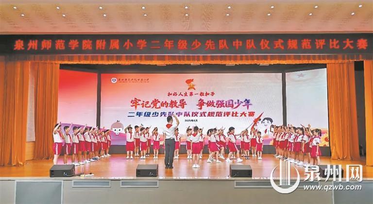 为提升少先队组织建设规范化水平,泉州师范学院附属小学举办了一场别开生面的少先队中队仪式规范评比大赛。出旗、唱队歌、呼号……每一个环节都严谨规范,少先队员们精神抖擞,展现了新时代少先队员的风采。