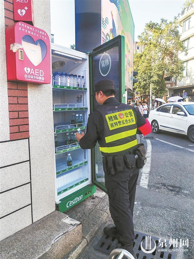 与其他点位不同,这里的爱心冰柜由交警担当补水志愿者。每天上午7点半,鲤城交警大队一中队的协警詹啟都到岗后,总会先给冰柜续水,再投入一天的执勤。他介绍,每天要补充六七箱水,高温天里,不时有环卫工、外卖小哥前来取水。