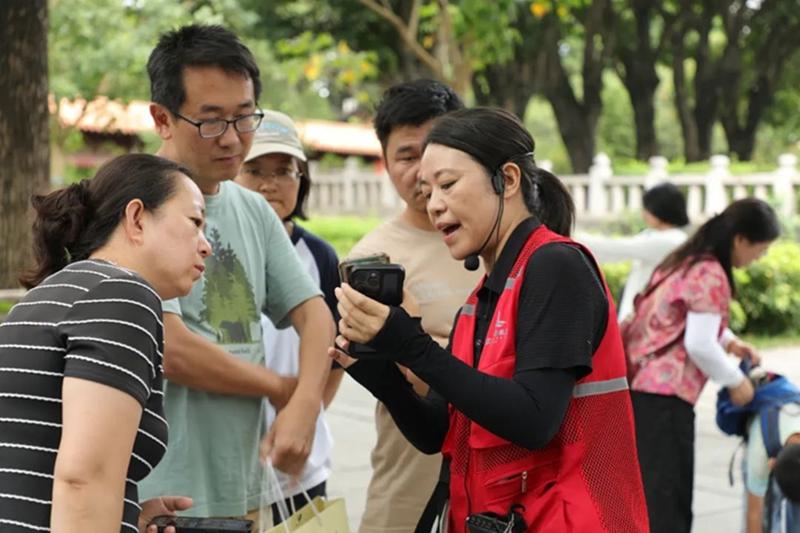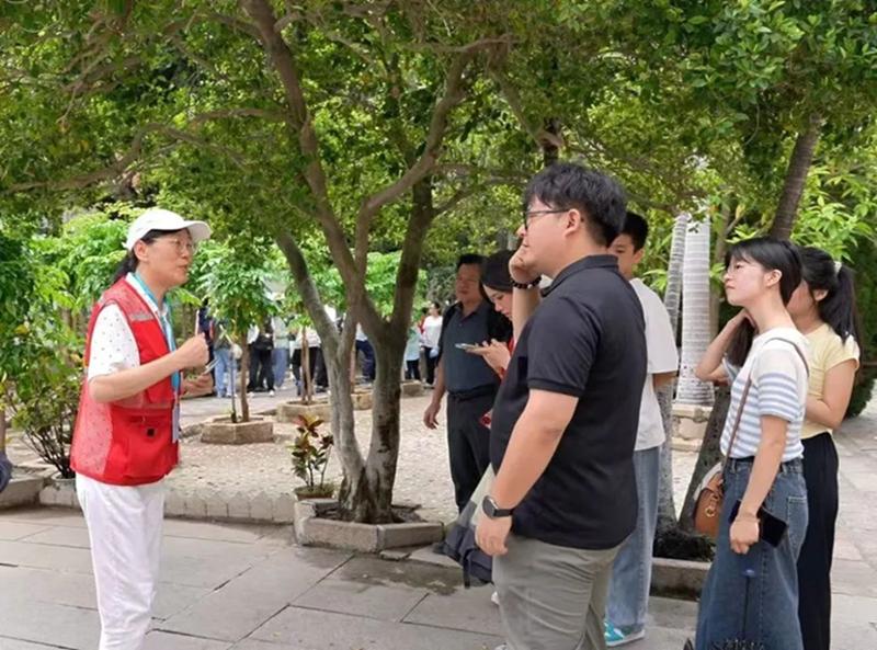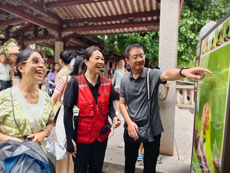 7月5日上午,清净寺内,讲解员褚雪梅正忙着为游客讲解,当天天气十分闷热,但她的声音依然清晰洪亮,笑容热情洋溢,那份专注与热情,仿佛能驱散夏日的暑气。“从事公益讲解最大的感受就是能愉悦自己。和学员、游客的互动交流,给我的退休生活增添了很多乐趣。”从通信行业退休后,褚雪梅便加入了世遗泉州文保志愿讲解服务队,她不仅用心学习泉州历史文化知识,还经常和队友们沟通交流、互帮互助。如今,站在游客面前,褚雪梅早已褪去生涩,讲解起来挥洒自如。
