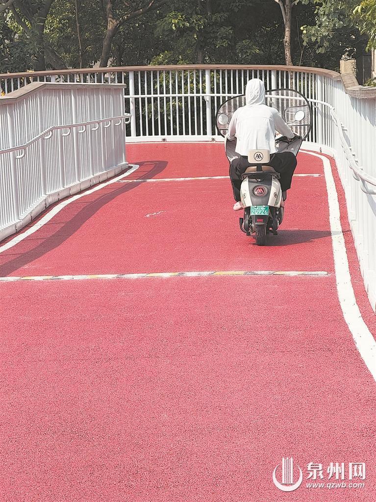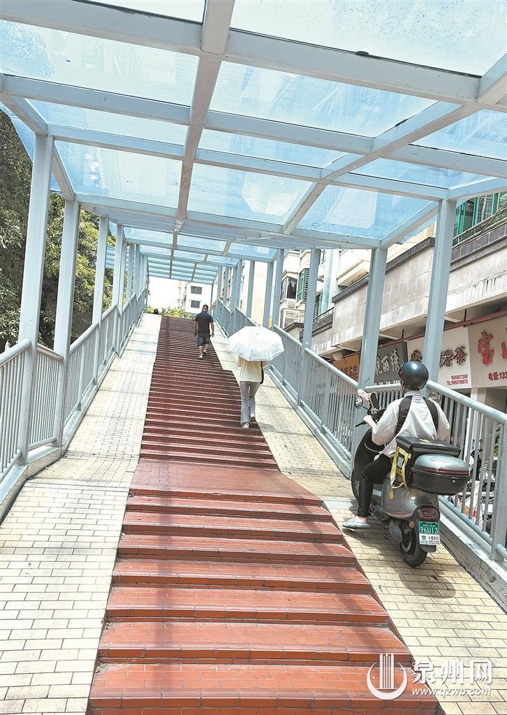 泉州师范学院门口的人行天桥经过改造,铺设了粗糙面刻槽防滑地砖以提升防滑性,同时天桥一侧为台阶、一侧为斜坡,实现了“人车分流”。不过,较大的坡度仍让通行体验打了折扣:骑行时需格外用力保持平衡,下坡时又得时刻控速防冲,即便推行也因坡度较大而费力。“改造过后变化还是挺明显的,下雨天也不会打滑了。”市民陈女士坦言,但坡度还是有些陡,上坡骑不动,下坡又冲太快,车多的时候还是会有一些担心。