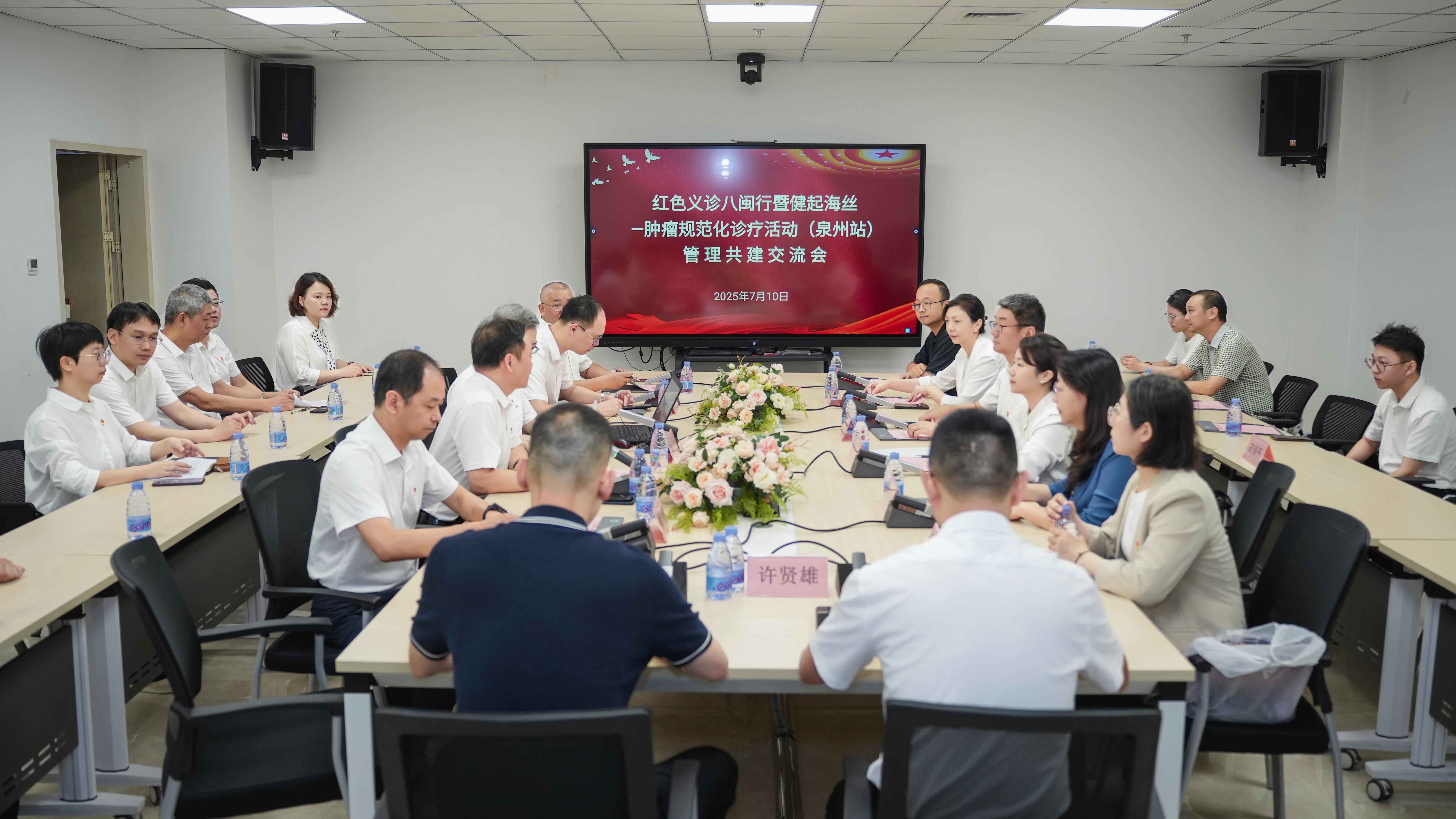 与此同时,管理共建交流活动在新病房大楼四楼大会议室举行。泉州医学高等专科学校附属人民医院党委副书记、院长洪朝辉主持了会议。会上,福建卫生报介绍了“红色义诊八闽行”项目,华山医院福建医院党政综合办执行主任卢瑛介绍了国家区域医疗中心概况,泉州医学高等专科学校附属人民医院党委书记陈名智也介绍了医院概况。双方还就管理共建意见进行了深入交流,并围绕“八闽行工作清单”展开了热烈讨论。
