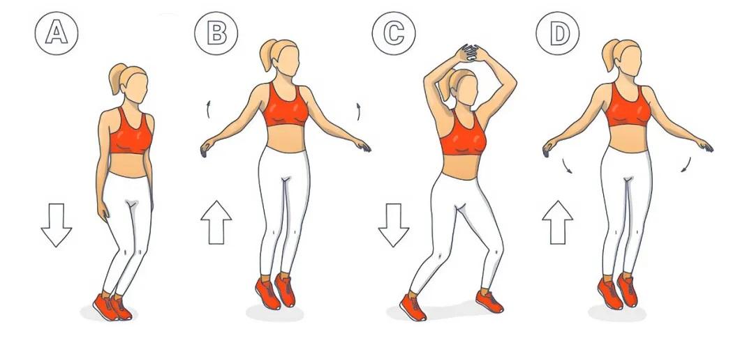 站立,双脚并拢,双手自然下垂;向上跳起,双脚向两侧分开至略大于肩宽,双臂向上举过头顶并拍掌;落地时双脚并拢,双臂放回身体两侧。
