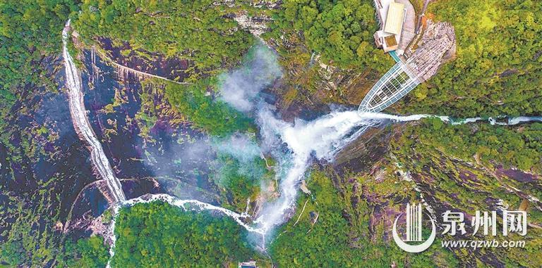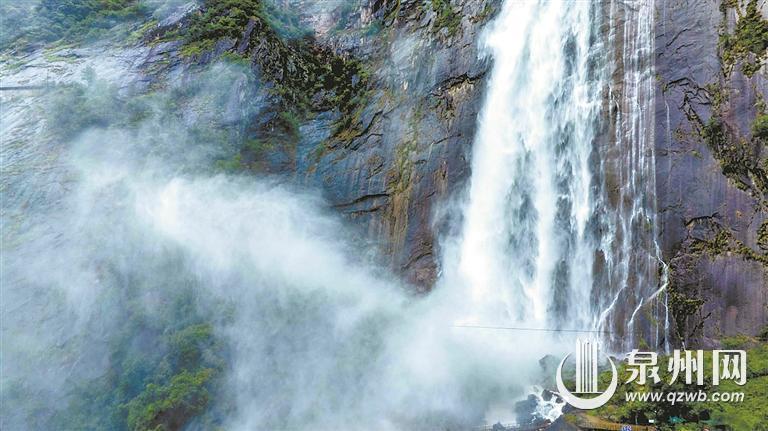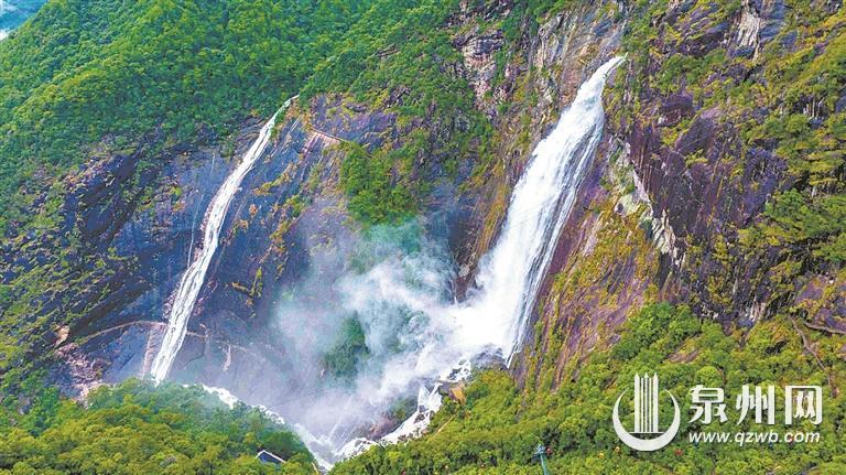 受前几日强降雨影响,德化石牛山岱仙瀑布水量大增,双瀑竞秀美景重现。水流自陡峭岩壁倾泻而下,似双龙竞跃,激起大量水雾,在青翠山峦映衬下,雄浑壮美,磅礴气势与朦胧意境交融,尽显大自然的神奇魅力。(庄丽祥 黄龙俣 摄影报道)