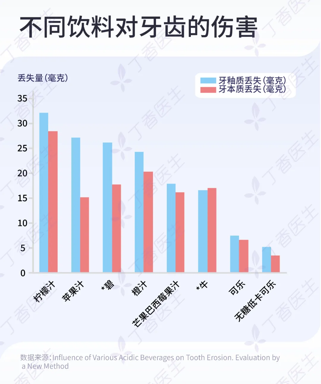 结果同样发现,柠檬酸溶液和橙汁对牙釉质侵蚀最大,明显高于无糖可乐。