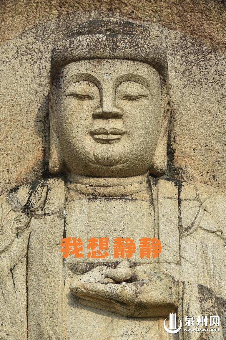 南安榕桥的开化洞阿弥陀佛造像同样名气不小,这尊大石佛高约5米,立于莲花座上。表情包直接为其配文:“我想静静。”这可能是因为佛像两目闭拢,身上衣褶波澜不惊,显得宁静安详,故有此一说。据《南安县志》载,这尊阿弥陀佛造像是宋代道士依石而凿的:“宋庆元初,道人陈大受,刳而为洞,名开化洞,平垣静深,夏凉冬温,前架一室,凿石为佛。”佛像雕刻手法以浮雕为主,保留着宋代流行的雕刻风格,即以朴实庄重为主。其冠服简单,衣纹简化,不饰项圈、臂钏、手镯等物,传递出大气、和善的感觉。