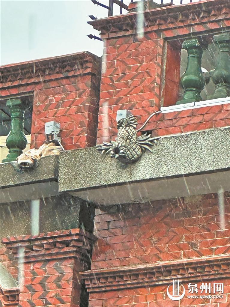 而往常比较少见的葡萄、菠萝、人物等造型的滴水构件也在中山路“安家”。这些创意十足的滴水构件与传统的样式看似风格迥异,但却同样承载着泉州人对生活的美好期许和吉祥的寓意。葡萄果实累累,象征着多子多福、丰收兴旺;菠萝在闽南语中被称为“旺来”,蕴含着福气旺盛、好运将至的祈愿;人物造型的滴水兽则憨态可掬,雕刻细腻传神,就像是定格了生活中的喜乐瞬间。