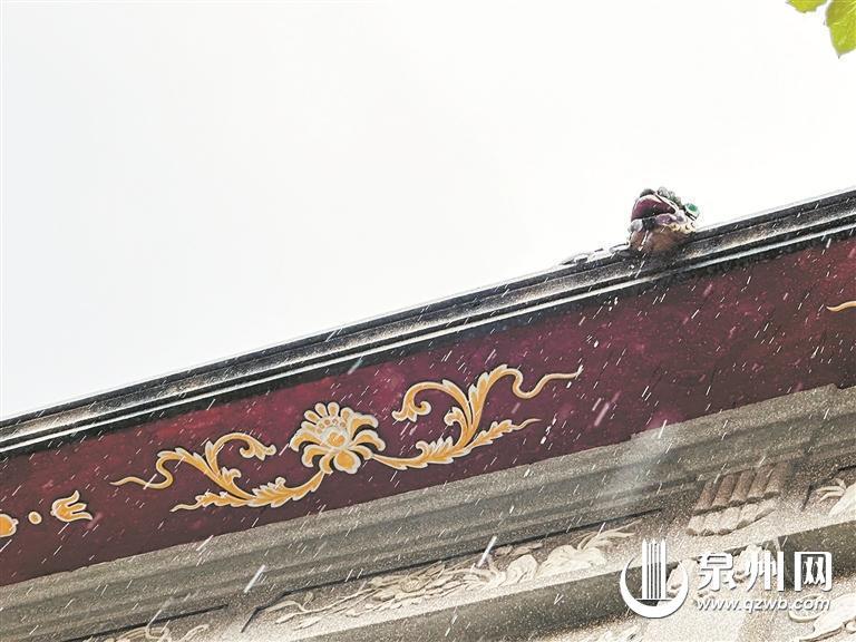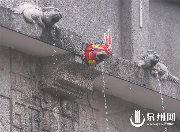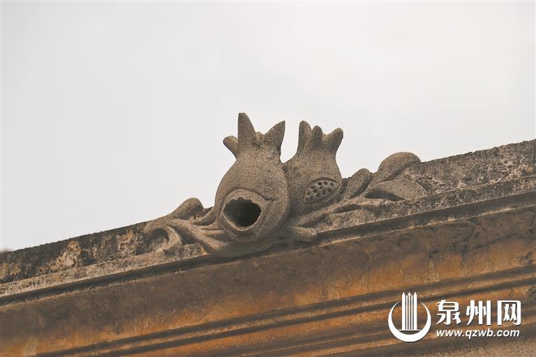 在泉州,还能看到植物造型的滴水构件。比如,石榴造型,石榴的“多籽”在工匠巧手刻画下十分逼真,暗喻“多子多福”;还有花朵造型的滴水构件,花瓣纹清晰可数,花心为排水口,有“花开富贵”的吉祥寓意,饱含了泉州人对美好生活的向往。
