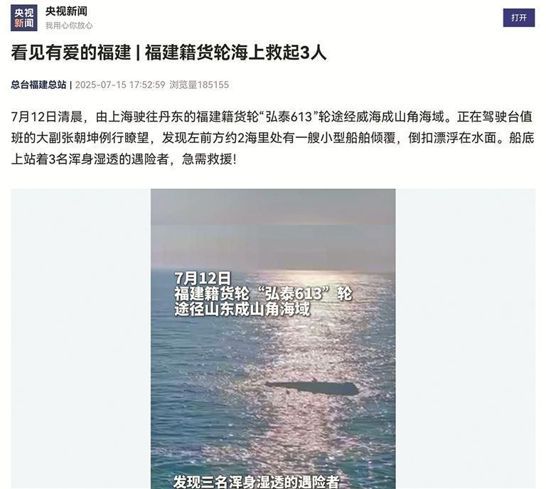 泉州网7月18日讯(融媒体记者张晓明 文/图)日前,南安市石井镇营前村货轮“弘泰613”轮在山东威海海域紧急施救,救起了3名因船舶倾覆而被困的船员。记者了解到,7月15日,央视新闻客户端推出报道《看见有爱的福建 福建籍货轮海上救起3人》,一经发布便引发强烈关注,浏览量很快突破18万次。