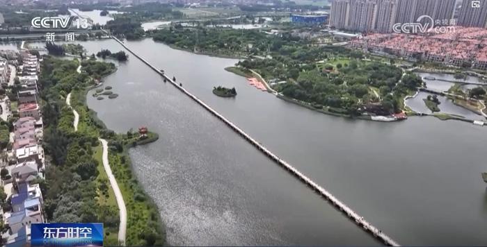 央视镜头首先以航拍视角带观众俯瞰安平桥全景。这座始建于南宋的古桥呈东西走向,桥面宽2.9米至4米,全长2255米。整座桥由厚重的条石铺筑,361座形态各异的石砌桥墩支撑起桥身,墩间架设的巨型石板长短不一,短则5米,长则有11米,气势恢宏,蔚为壮观。