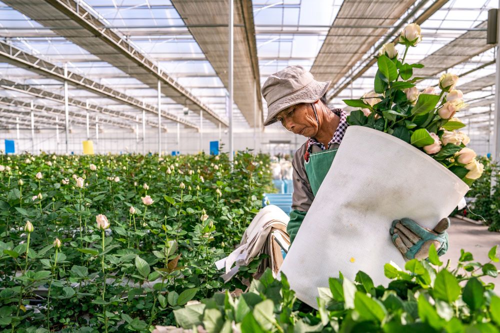 盛夏丽江,艳阳高照。玉龙雪山脚下的云南丽江现代花卉产业园,一座座智能温室大棚里,炽热的阳光穿过散射玻璃顶,变得轻柔和煦,洒在一枝枝竞相盛放的玫瑰花上。