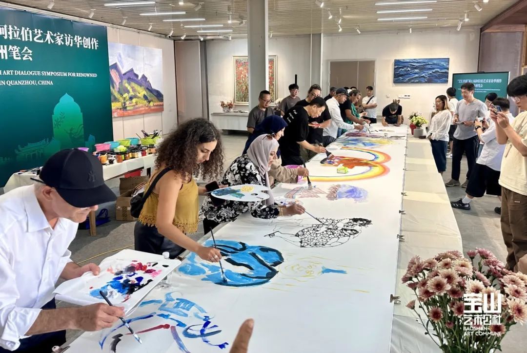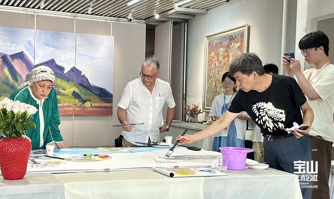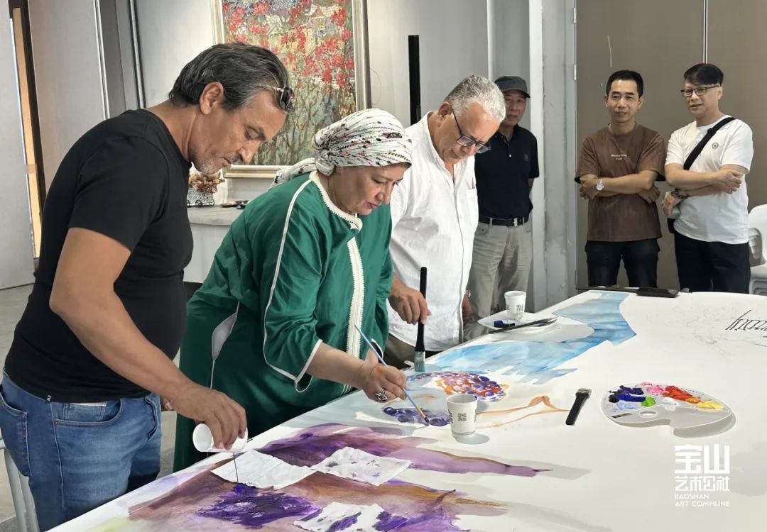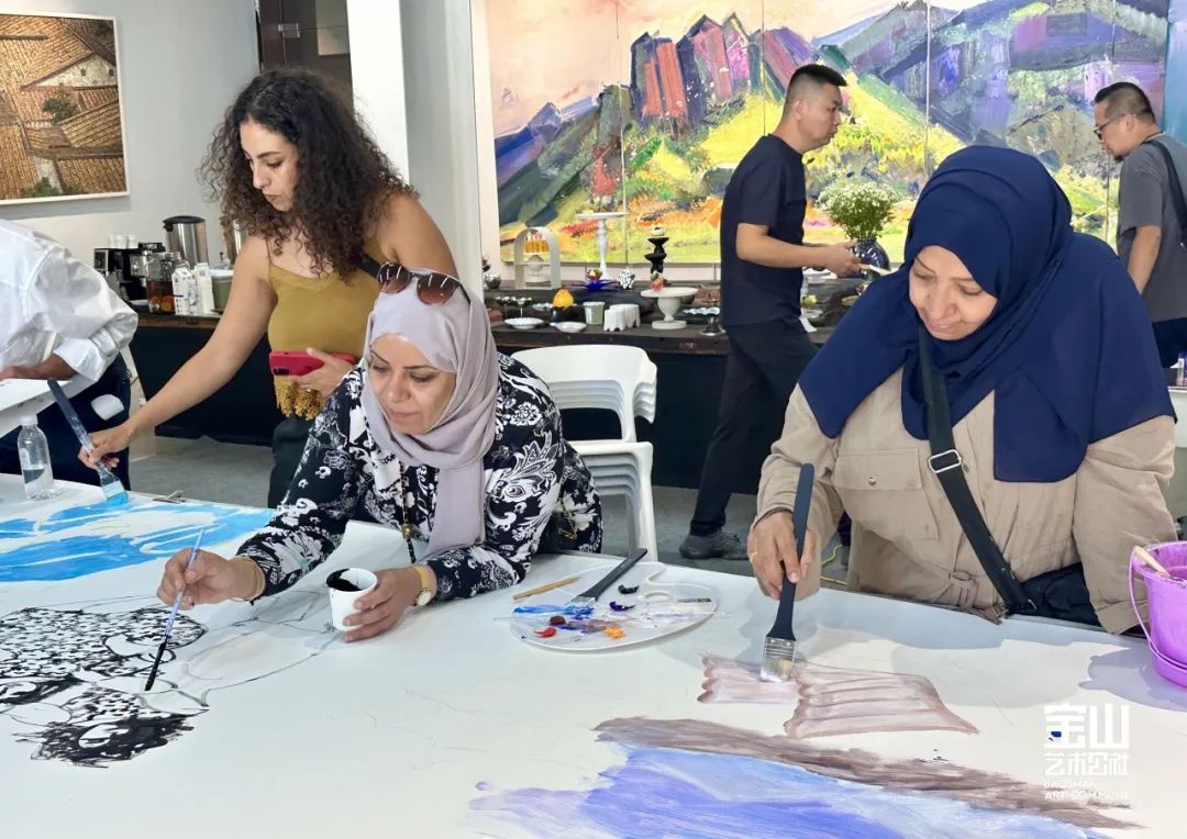 中阿二十几位艺术家在宝山艺术公社进行交流探讨,两地艺术家共同携手别开生面地绘制出富有创造性、立意新颖、画面极具东方神韵合作笔会,共绘中阿艺术家心中所感中国图式,缔结中阿两地友好情谊。