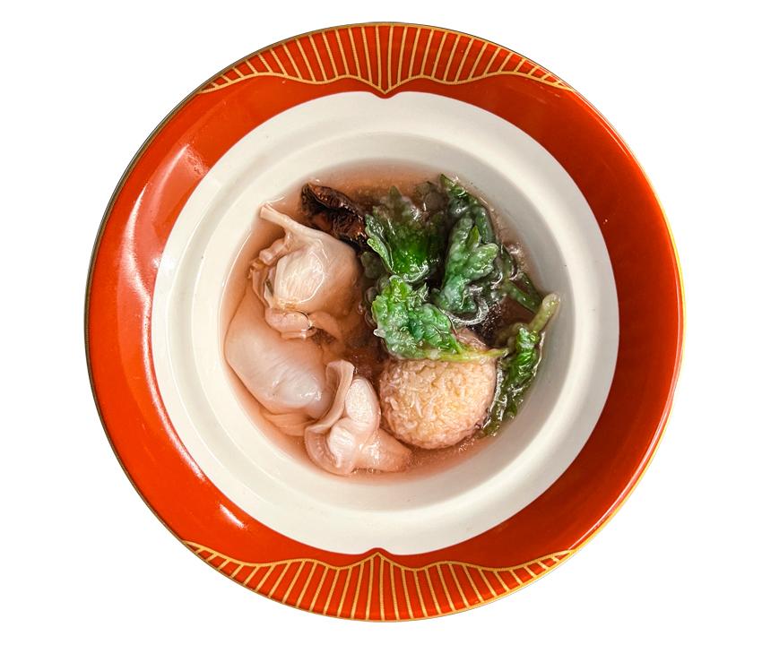 “拨霞见日——红菇汤汆干贝球贵妃蚌”:这道菜的灵感来自南宋泉州籍美食家林洪《山家清供》里的“拨霞供”。红菇清汤热气腾腾地汆入,瞬间激活海鲜的风味,像朝霞映红海面,将味觉唤醒。