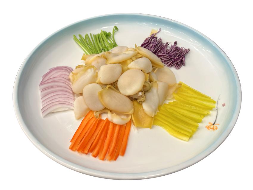 “风生水起——黑松露捞起围头鲍鱼片”:晋江围头鲍鱼是福建的海产珍品,深得苏东坡“东风吹作黄金色,好啖鳆鱼海中鲜”的神韵。时令蔬菜切丝,与鲍鱼片一同捞起,寓意风生水起。