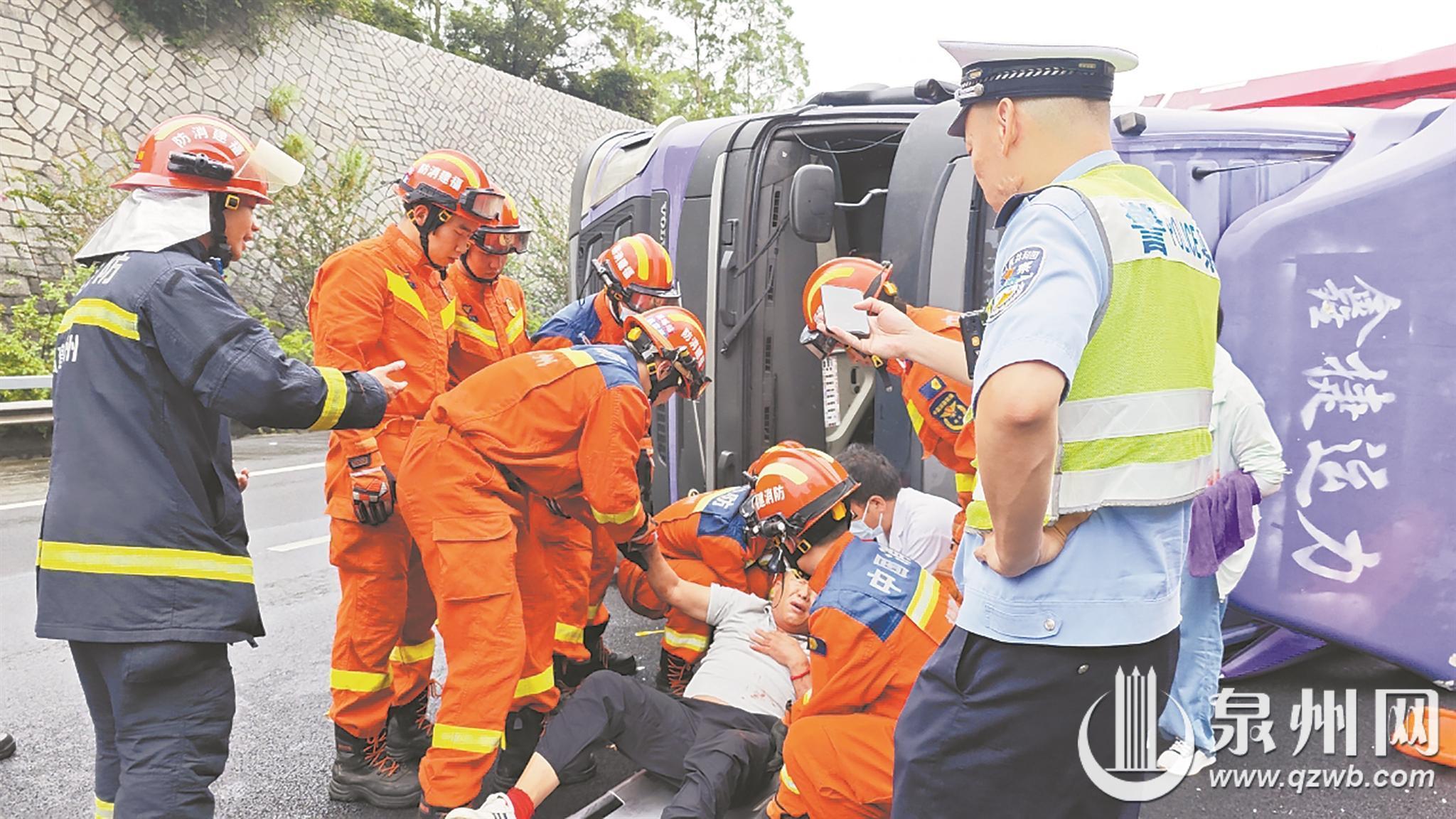 泉州网8月7日讯(融媒体记者傅恒 通讯员黄开明 郭云霞 文/图)8月5日上午,沈海高速泉港往泉州方向3公里处发生一起货车侧翻事故,车内两名人员被困,情况紧急。泉港区南埔消防救援站接警后迅速赶赴现场救援。