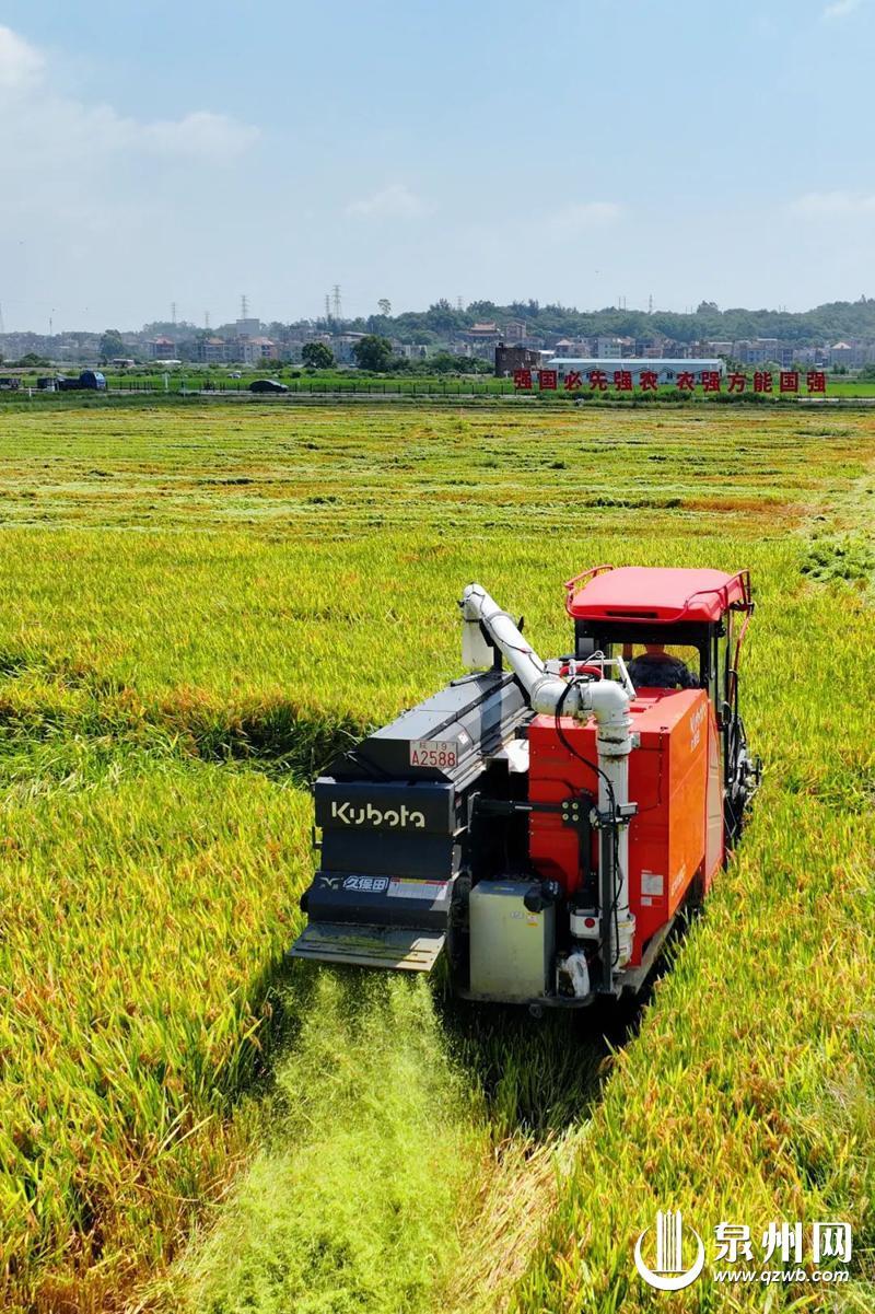泉州网8月8日讯(融媒体记者林志安 通讯员汤丽凡 卢鹚 文/图)立秋的风吹来了丰收的气息,在位于惠安县的国家现代农业产业园走马埭示范片区,700亩早稻进入收割期,风吹稻浪,“丰”景如画。