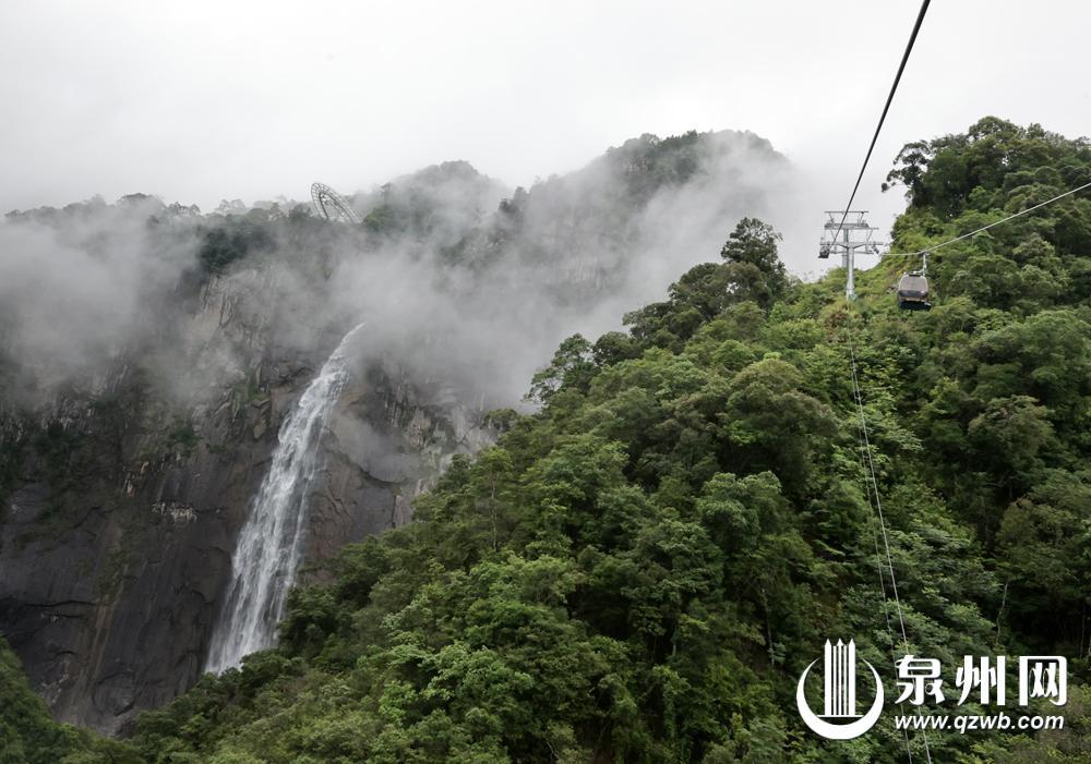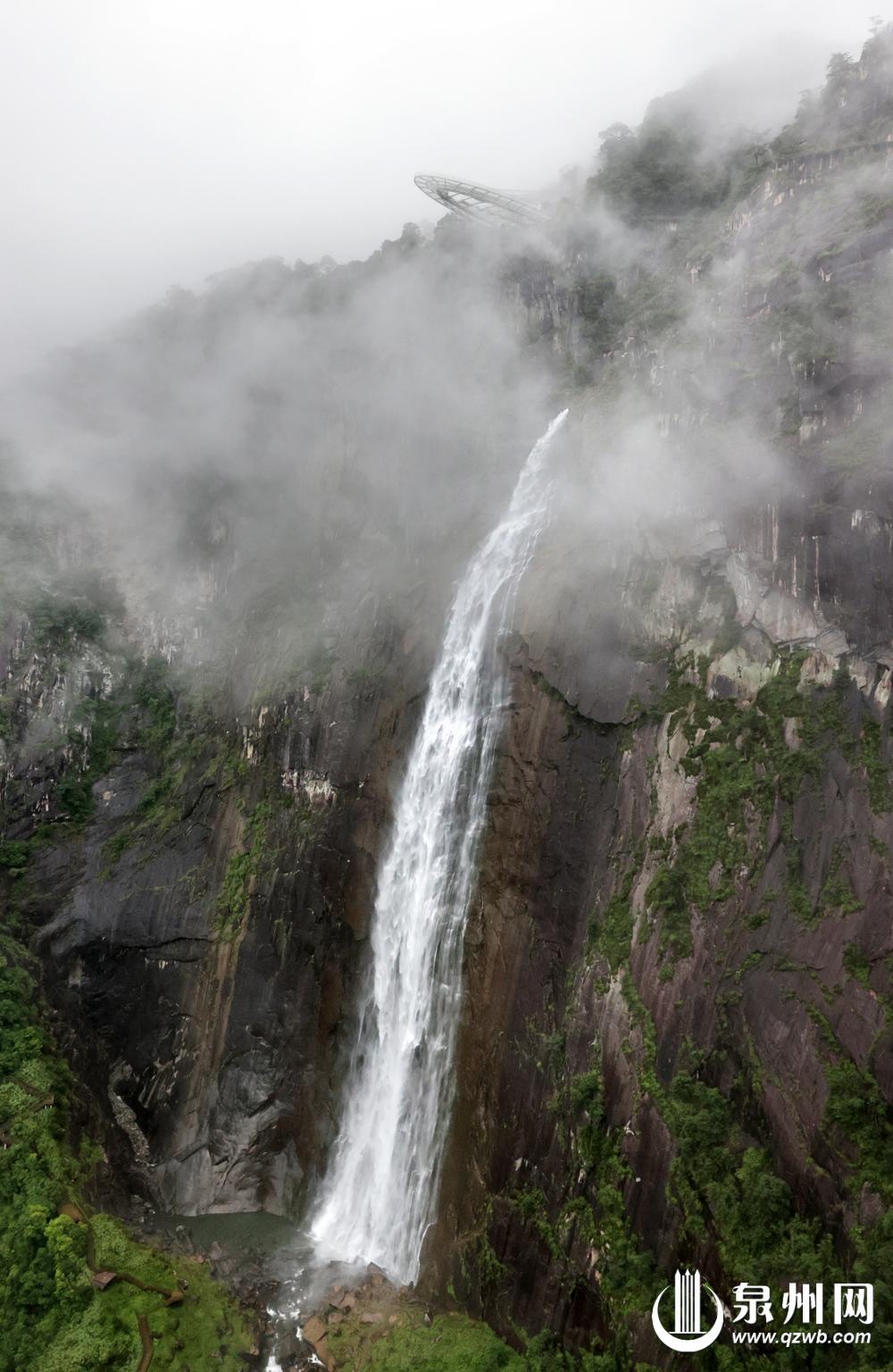 岱仙瀑布位于德化石牛山,素有“华东第一瀑”之称。丰水期时,水流从陡峭岩壁倾泻而下,气势磅礴,恰似李白笔下的“飞流直下三千尺 疑是银河落九天”的壮阔。(张九强 摄)
