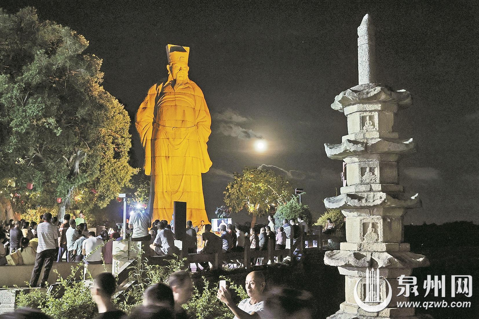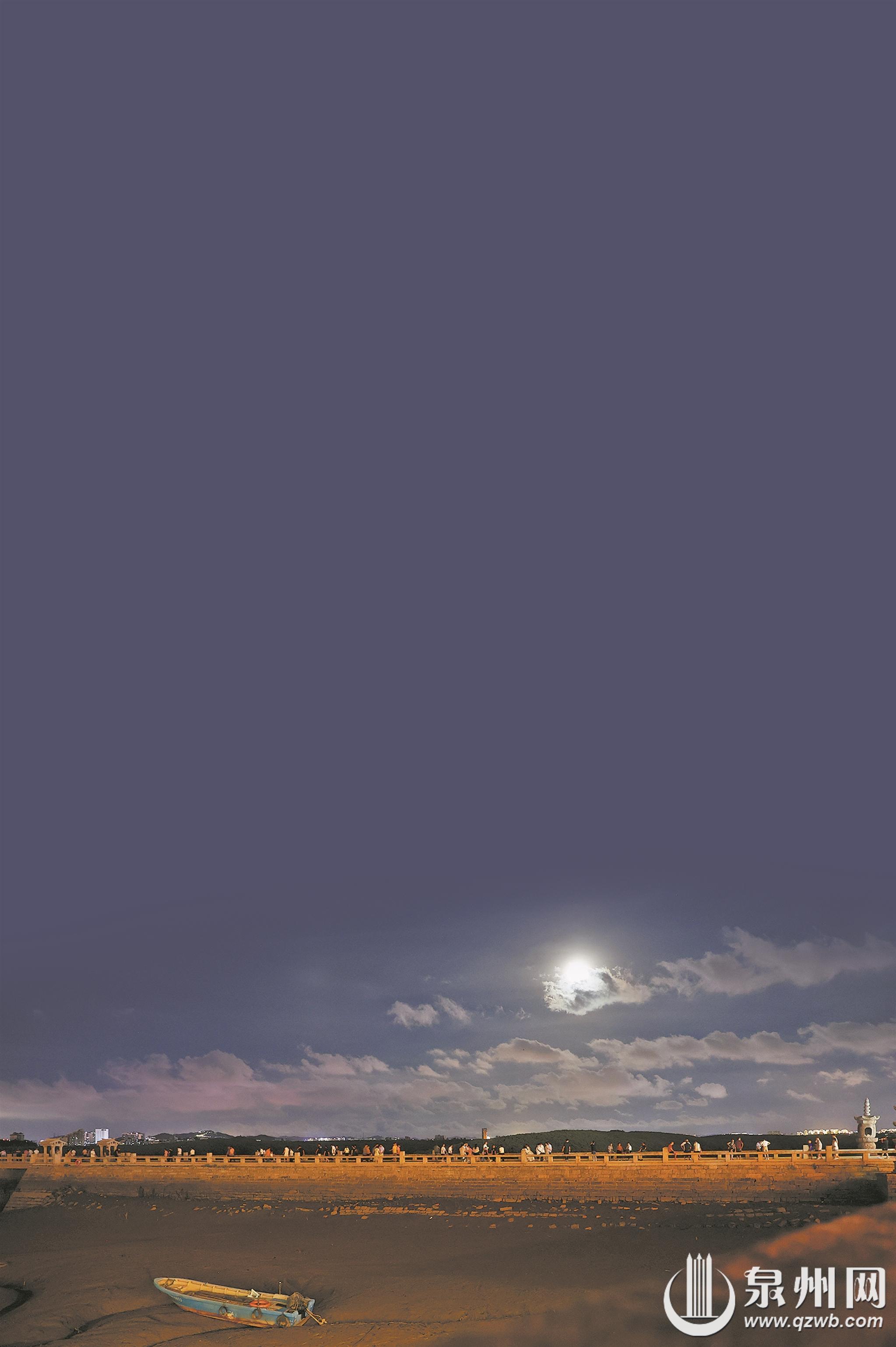 桥北的蔡襄雕像在灯光映照下熠熠生辉,守望着这座凝结了古人智慧的石桥。桥头处,当地村民摆起小摊,售卖石花膏、四果汤等闽南特色消暑小吃。市民游客们聚在一起赏月听歌,孩子们嬉戏奔跑,为古桥增添了几分生活的气息。