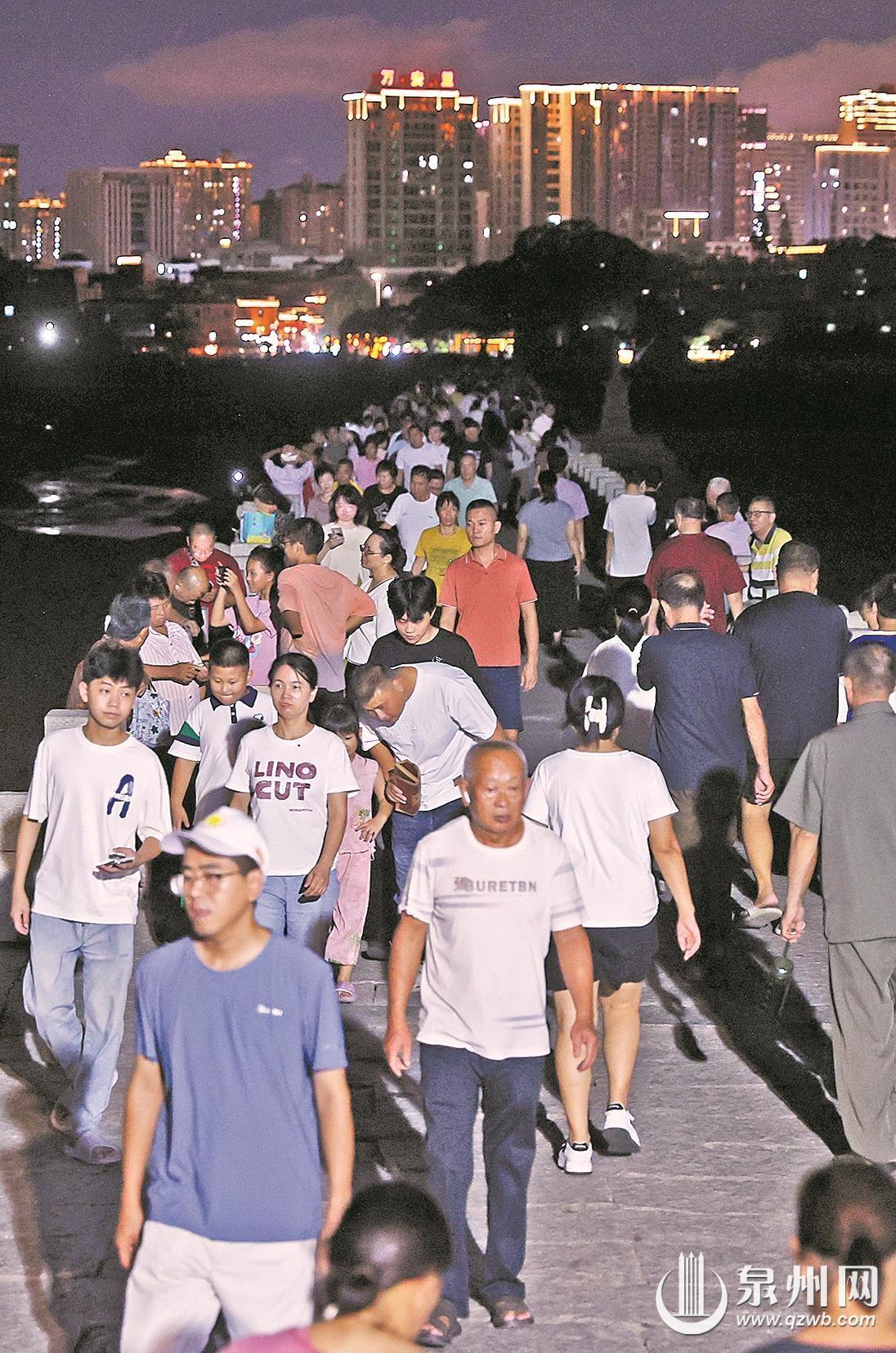 三伏末尾,泉州持续高温,不少市民选择“昼伏夜出”,在夜晚寻觅一方清凉。作为世遗点的洛阳桥褪去白日的喧嚣,在月光与灯影的交相辉映下,成为市民游客松弛漫步、避暑纳凉的绝佳去处。