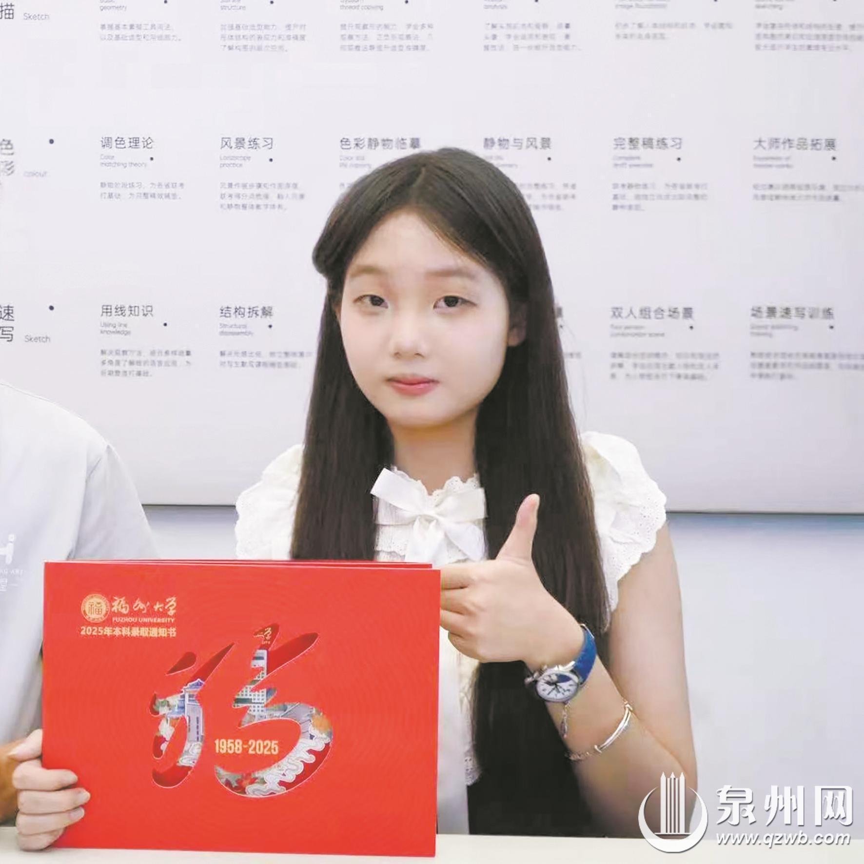 泉州九中毕业生林知之以艺术生的身份成功考入福州大学设计学专业。“福大一直是我的理想院校之一。”她笑着说道,“收到录取通知书时,虽然早有心理准备,但那份喜悦依然溢于言表,父母也为我由衷骄傲。”谈及对未来的规划,这位准大学生饱含期待:“我希望在大学这个新环境中,在专业能力上获得突破,以后在热爱的设计领域绽放光彩,同时始终保持对艺术的纯粹初心。”特别让她心动的是该录取通知书的设计巧思,“封面那个精致的镂空书法‘福’字独具匠心,透过它可以看到内页的精美图案,这样的设计细节完全戳中了我们艺术生的审美点。”她说。