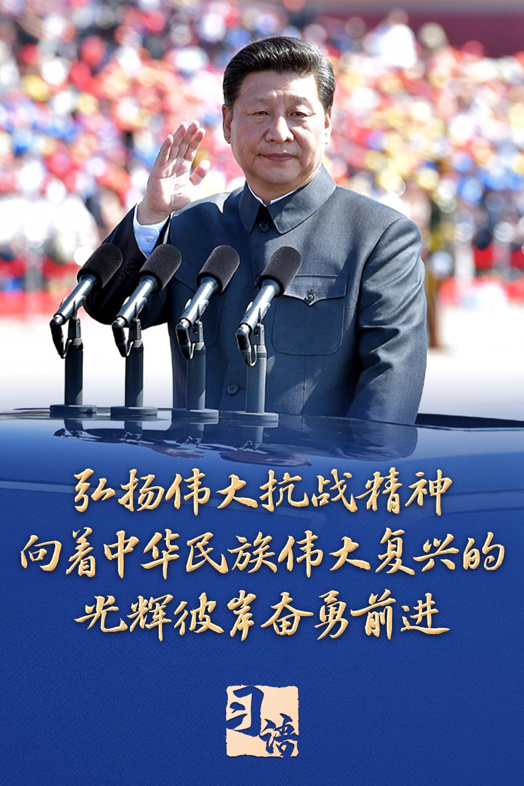 “全党全军全国各族人民,海内外所有中华儿女,要更加紧密地团结起来,弘扬伟大抗战精神,向着中华民族伟大复兴的光辉彼岸奋勇前进。”