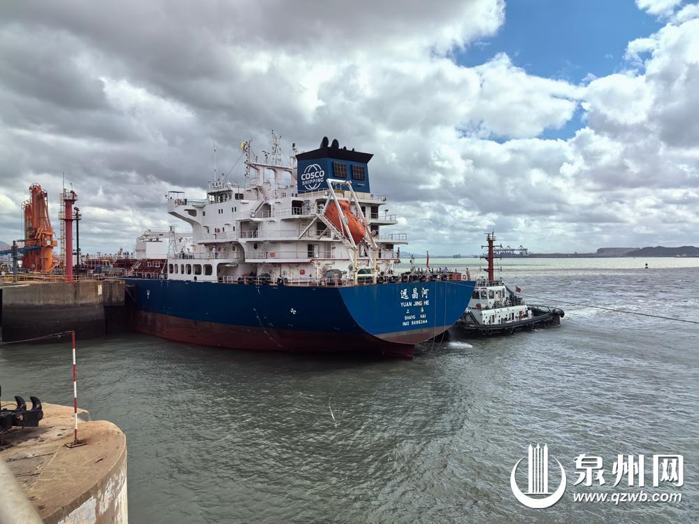 泉州网8月19日讯(融媒体记者许雅玲 通讯员刘冬元 文/图)近日,中远海运能源运输股份有限公司所属大型油轮“远晶河”轮顺利靠泊泉州肖厝港区福建联合石化鲤鱼尾码头10万吨级泊位卸货。该轮自东帝汶载运2.4万吨凝析油,历时10天海上航程,直进直靠顺利抵港。