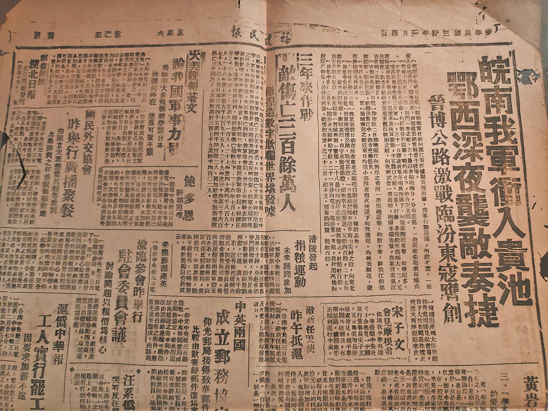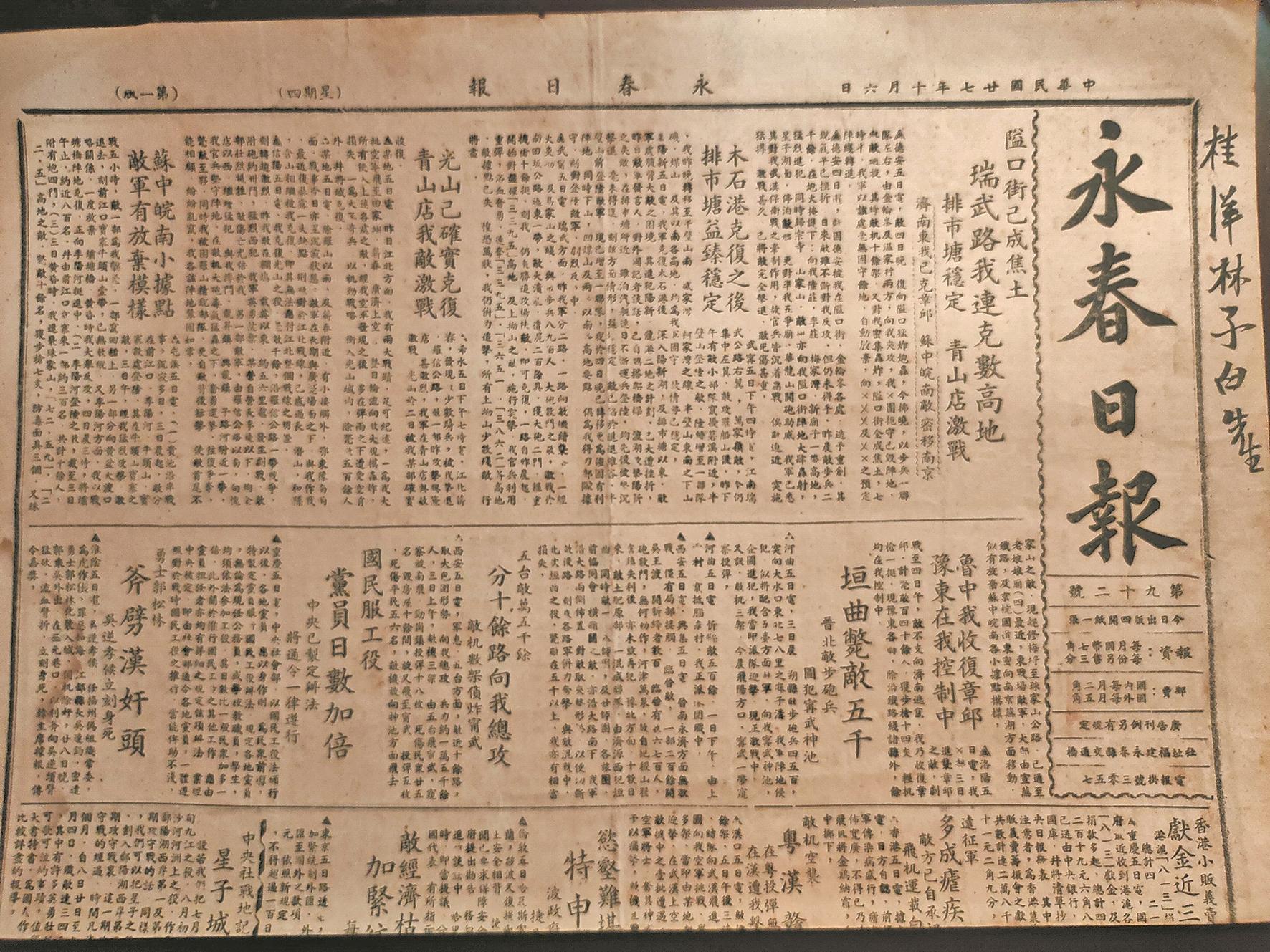 收藏家吕志华展示的1938年10月1日的《永春日报》上,刊发着《宣城昨晨克复 富阳敌开始溃退 要塞区我移新防线》《瑞武南克三地 敌已溃不成军》《光山方面无改 罗山城郊激战》等战事新闻。其一称:“昨晚十时,我某部突袭宣城,敌从梦中惊醒,仓皇应战。我军英勇无匹,反复冲杀,如入无人之境,肉搏一小时,全城之内,积尸数百具,血流成渠,三十日拂晓,敌不支纷向芜湖方向溃退……”虽然这是发生在87年前的战事,如今读来仍令人热血沸腾。