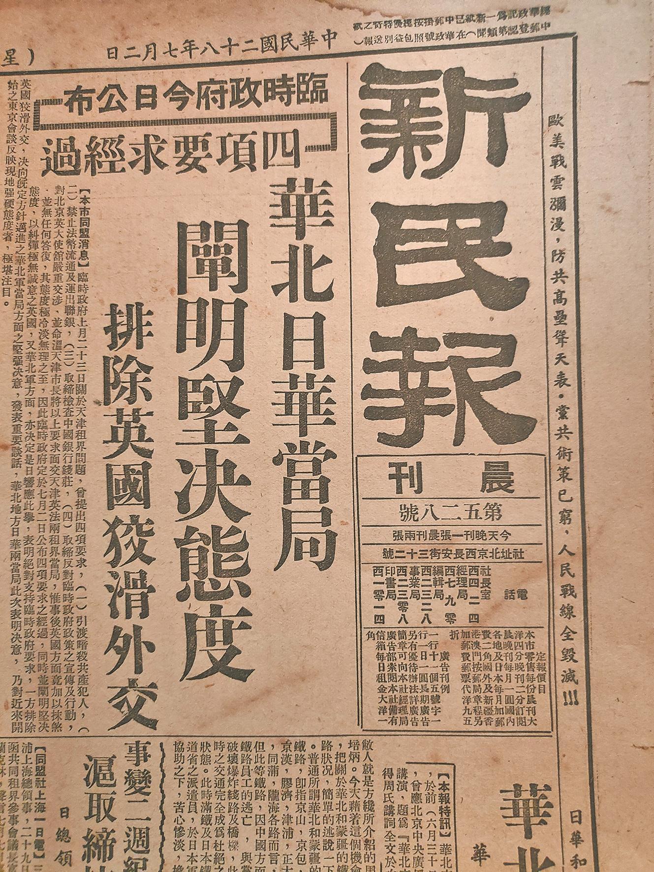 《新华日报》华北版是中共中央北方局机关报,1939年创刊于山西沁县后沟村,社长兼总编辑为何云。收藏家傅志雄提供了一份1940年1月1日刊印的《新华日报》华北版,该报除了刊发《迎接民国二十九年》社论及各地消息外,还报道了《各地民主浪潮澎湃 太谷民选县长 抗日政府宣布施政十大纲领》等新闻。1940年,中国的全面抗战进入了第四个年头。面对国内外极为复杂多变的形势,中国共产党高举抗日民族统一战线的旗帜,发挥中流砥柱的历史作用,承担起拯救民族于水火的历史重任。在抗日战争时期,是否要实行民主政治,始终是国共两党政策的主要区别之一。1939年9月,国民参政会通过“实行宪政”的决议后,共产党和各民主党派要求国民党结束党治,实行宪政,掀起了第一次宪政运动热潮。《新华日报》华北版在1940年元旦之时发出“各地民主浪潮澎湃”的报道,即是反映民众争取新民主主义政治的努力。中国共产党积极支持全国人民的民主宪政要求,推动大后方民主运动的发展。这张报纸为我们展示了抗战时期斗争的不同侧面。