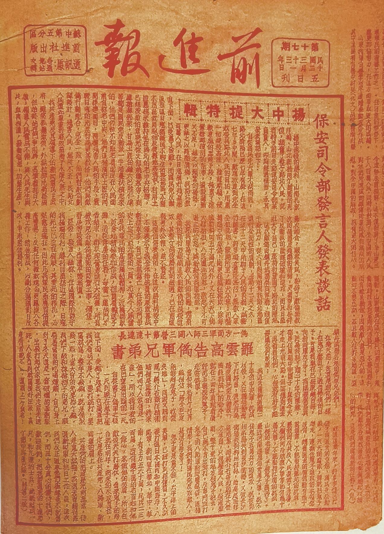 《前进报》先后由中共澄武锡工委澄西民运工作队、中共京沪路北特委、中共丹北中心县委、中共苏中第五地委主办。该报创刊于1940年5月,1943年春停刊;1944年8月18日复刊,直至1945年10月中旬终刊。在傅志雄展示的一份1944年12月1日出版的第17期《前进报》(此时该报为苏中第五地委机关报)上,我们看到其头版以红色油墨印刷,在显著位置刊登《扬中大捷特辑》消息,整个版面充满浓厚的胜利氛围。1944年,随着新四军冬季攻势的开展,中共丹北中心县委、丹北独立团经研究决定:在当年11月拔除位于扬中本岛中部的老郎街据点,解放扬中县南半部。战斗打响前,中共丹北中心县委、丹北独立团进行了充分的战前准备,并与老郎街据点伪军第十连连长罗云高取得了联系,说服其在战斗中率部起义。11月19日,丹北独立团两个连,在县警卫营及罗云高所率起义部队配合下,一举攻克老郎街、油坊桥、八桥镇、大泡子、兴隆港等5个敌伪据点,并在兴隆镇击退日伪军两次增援,解放了兴隆镇以南地区。击毙日警备队长寺田贞一,班长田中以下日军20余人,伪军3人;俘虏伪连长以下官兵200余人,缴获轻机枪2艇,步枪200余支,短枪10余支,子弹数万发,各种军用品五六十担。苏中五分区司令员韦永义授予罗云高部“扬中游击大队”番号,任命罗云高为大队长。“扬中大捷”极大地鼓舞了全国抗战的热情。