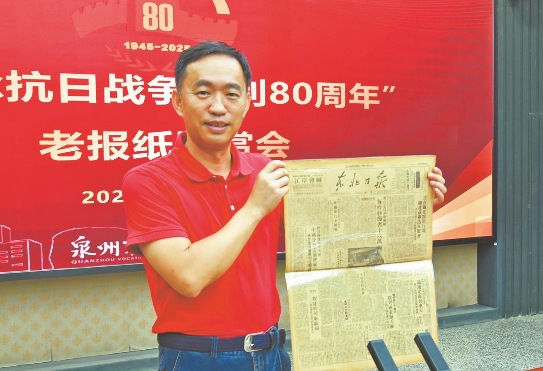 为纪念中国人民抗日战争暨世界反法西斯战争胜利80周年,日前,中国报业协会集报分会组织30多位来自北京、天津、江西、湖南、湖北、福建等省市的集报家和红色史料收藏家来到泉州职业技术大学,举行“纪念抗日战争胜利80周年”老报纸交流座谈会。这些报纸再现了数十年前全民浴血守卫山河的壮举,是我们民族抵抗外侮、勠力抗争的真实记忆,亦是历史留下的不朽篇章。