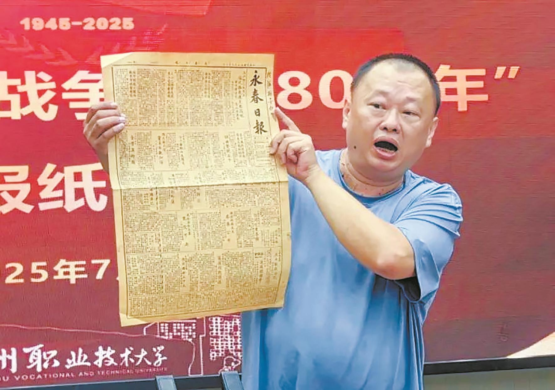 活动现场,泉州红色报刊收藏家傅志雄(现任职于泉州职业技术大学)、吕志华(现于永春第二中学任教)等向人们展示了他们珍藏多年的抗战老报纸,其中不乏讲述烽火战事的《福建民报》《永春日报》《新民报(晨刊)》《太岳日报》《拂晓报》《人民报》创刊号等。除此之外,傅志雄还向福建省委党校(福建行政学院)图书馆提供了近80份红色老报纸的原件或复制件,作为该馆“抗战中的文献展”的主要展品供学员参观鉴赏。这些抗战老报纸虽薄却有千钧重。翻阅它们,数十年前的金戈铁马如在眼前。报纸上密集排布的铅字,不只是战争进展的简报,更映照着一个民族在血火淬炼下的铁骨与精魂。