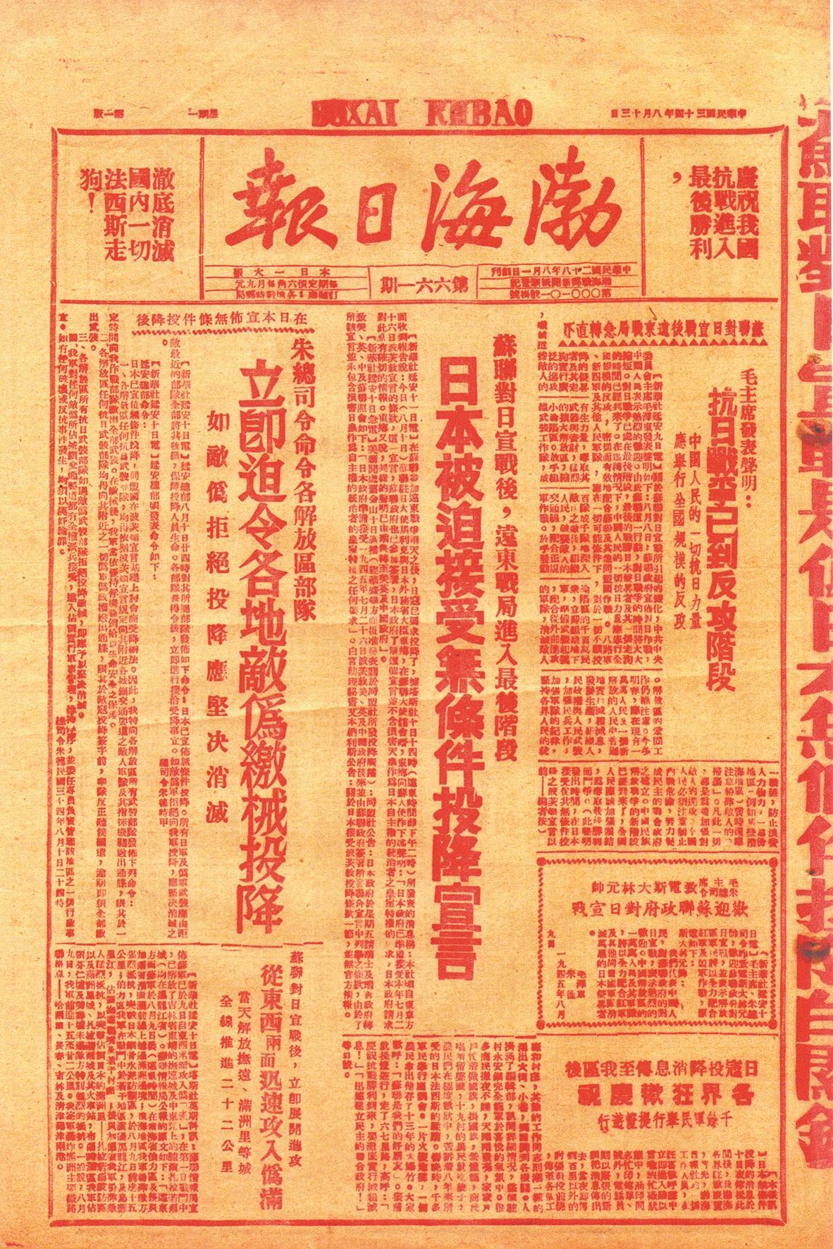 1945年8月,日本败局已定。毛泽东号召对日全面反攻,朱德命令各解放区武装歼灭拒降敌军。《大浪淘沙——红报里的中国共产党党史》一书披露了一张1945年8月11日出版的《大众日报》号外(对开单版)。该号外刊登了《毛主席发表声明:由于苏联对日宣战 抗战已到最后阶段》《朱总司令命令所属部队收缴所有日伪军武装》等消息,为日本侵略者敲响了丧钟。