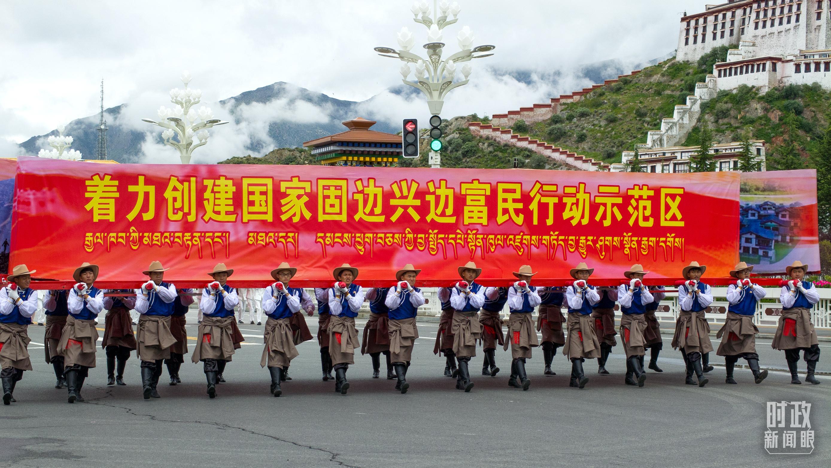 在庆祝大会的群众游行环节,“四件大事”单元展示了西藏自治区“四个创建”的奋斗目标:着力创建全国民族团结进步模范区、着力创建高原经济高质量发展先行区、着力创建国家生态文明高地、着力创建国家固边兴边富民行动示范区,分别对应稳定、发展、生态、强边四件大事。