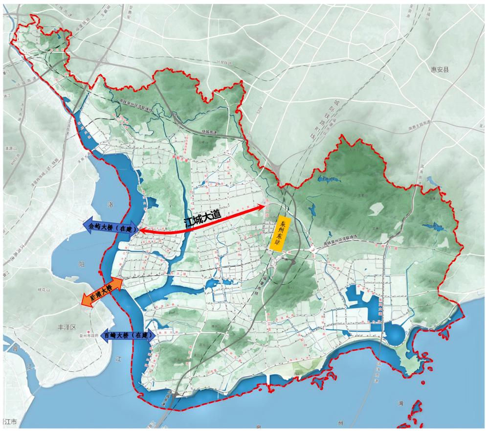 作为台商投资区“五纵五横”交通网的重要组成部分,江城大道西接金屿大桥直达城东、东至海山大道直达高铁新城,是泉州高铁东站的主要集散通道之一,也是推动海江片区和高铁新城开发建设的关键基础设施。通车后,洛阳江两岸通行效率将大幅提升,城东片区的综合服务资源得以快速对接海江创新产业需求,实现海江高端人才社区与城东宜居宜业环境高效联动,成为串联两岸、服务区域协同发展的“黄金交通轴”。