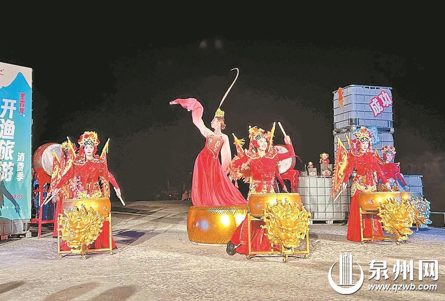22日晚,女子鼓乐表演《鸿运鼓舞》用鼓槌敲击出开渔的热闹序章,吸引众多村民和游客观看。随后,由小演员带来的高甲戏《郑成功校场练兵》表演,引来阵阵掌声。舞蹈《逐梦海丝》带大家沉浸式感受渔乡的浪漫。烟火点亮的海岸上,一辆辆满载海蛎等渔产品的拖拉机从岸边驶来,将活动推向高潮。
