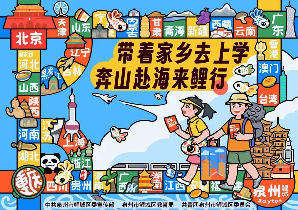 主题明信片、精美贴纸……打开“鲤城行囊”,各类文创礼品采用原创手绘,融入丰富的鲤城元素,设计细节诚意满满。文创牛皮纸袋封面上的“鲤行棋”趣味结合飞行棋玩法,将全国各省市特色元素巧妙嵌入棋格之中,体现了鲤城对学子满载星光荣耀出发,归来共绘古城新篇的希冀;明信片上,南音、飞天等手绘元素,与东西塔、府文庙、燕尾脊等特色地标交织呈现,彰显设计巧思;贴纸设计上,以艺术化的“鲤城”二字为主体,巧妙融入了世遗景点、非遗技艺、民俗活动与地道美食等众多元素,将古城的文化精华凝于方寸之间。贴纸上“平安无代志”的叮嘱,更寄托了家乡对学子深切的关怀与祝福。