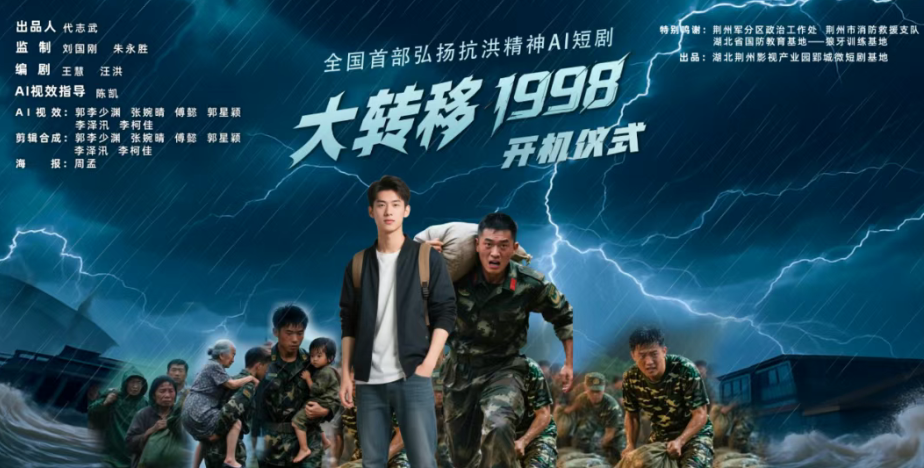8月25日上午全国首部以弘扬抗洪精神为主题的AI微短剧《大转移1998》在湖北荆州影视产业园郢城微短剧基地开机该剧由荆州市传媒集团AI工作室团队打造首次实现剧本创作、角色生成到后期制作的全程AI技术赋能这标志着荆州在布局新兴影视生产力领域迈出跨越性一步