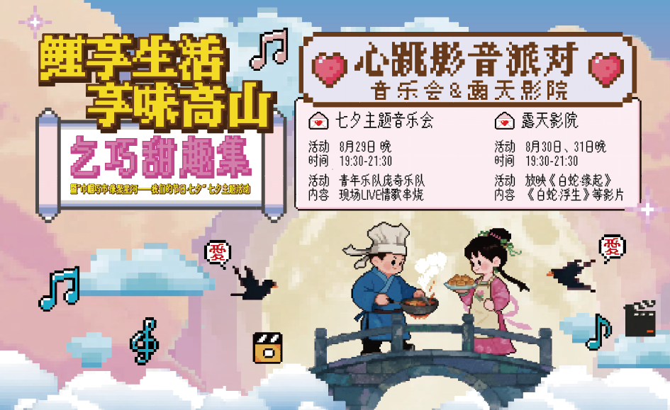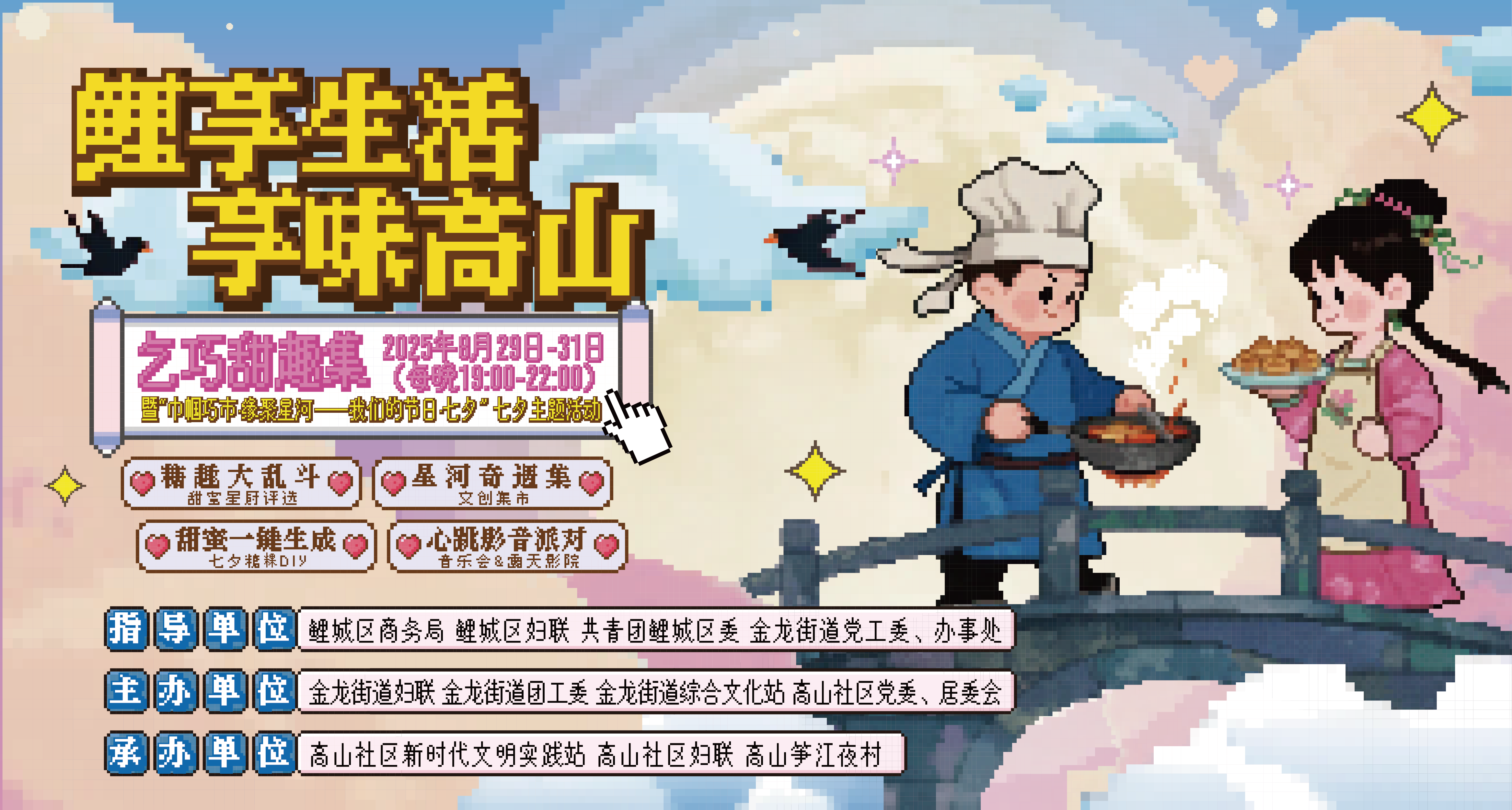 为进一步激发夜间消费活力,丰富群众文化生活,搭建创业实践舞台,8月29日至31日,高山笋江夜村广场将化身浪漫胜地!“鲤享生活·享味高山”乞巧甜趣集暨“巾帼巧市·缘聚星河——我们的节日·七夕”主题活动即将开启!