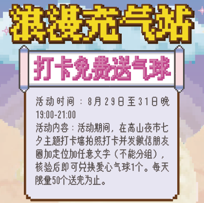 任务攻略:在七夕主题打卡墙拍照留影并发至微信朋友圈,需附定位及任意文字描述,不可设置分组,通过核验即可领取爱心气球一个。