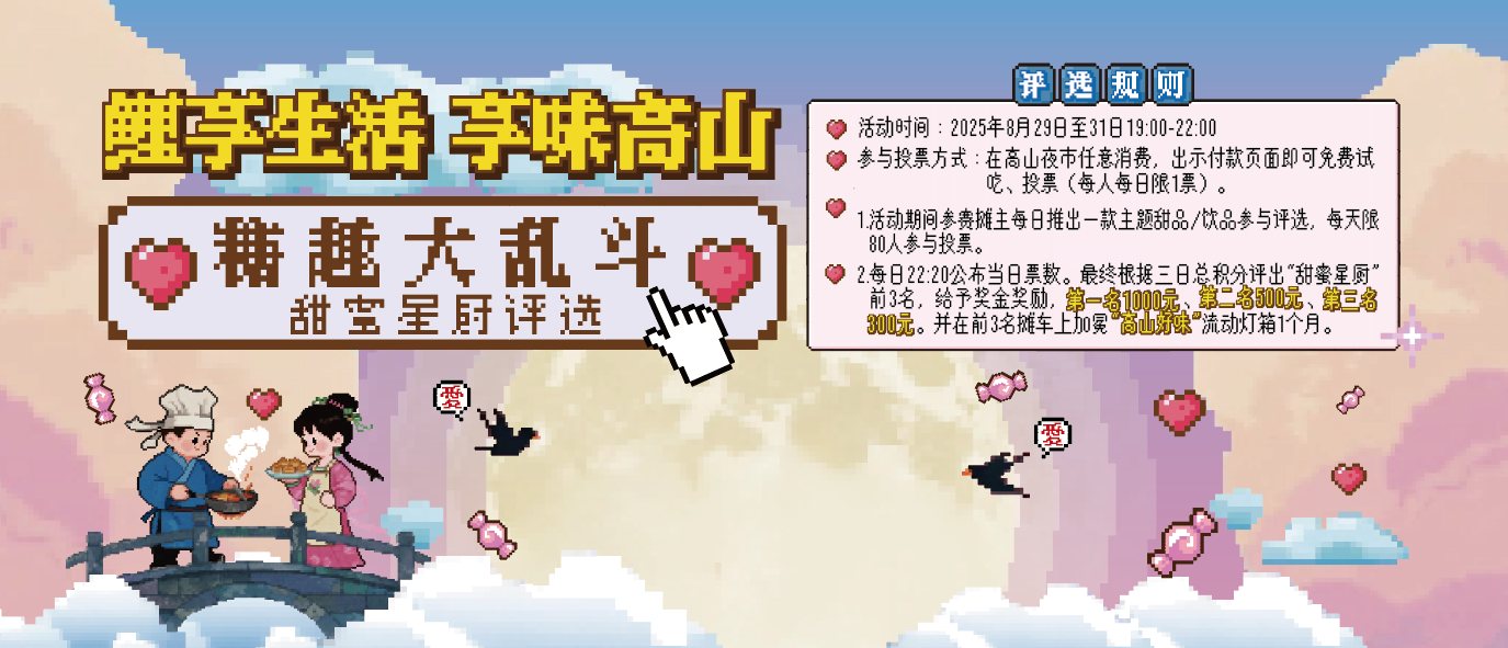 注:每人每日限1票,每天限80人参与投票。快助力你喜爱的摊主夺得千元奖金+“高山好味”限定流动灯箱!