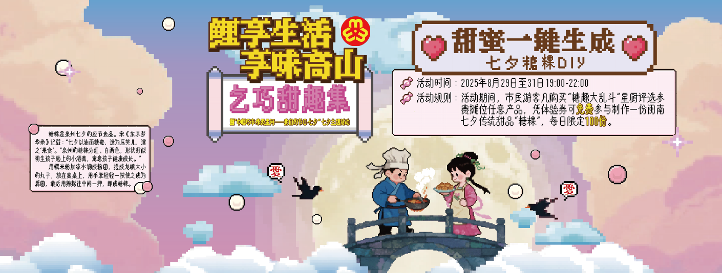 任务攻略:购买“糖趣大乱斗”参赛摊位的任意产品,可获得【糖粿兑换券】,免费制作一份闽南传统七夕甜品“糖粿”。