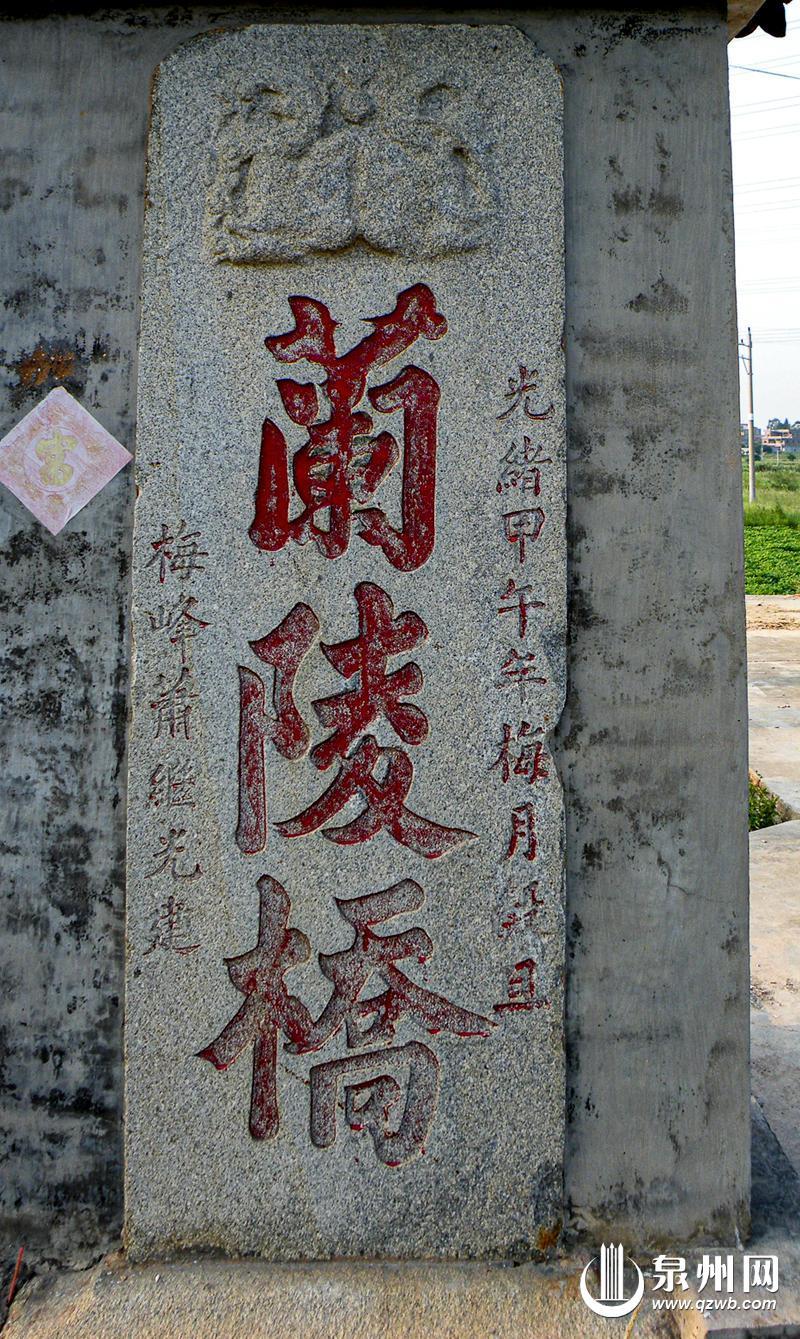 这座被当地人亲切称为“爱情桥”的百年石桥,如今静卧于南埔镇西溪之上,连缀起施厝村与埭头村。桥头靠施厝村口处有一座龙山宫,其旁侧墙壁上嵌有一方桥碑,碑额上刻双龙戏珠浮雕,中间竖刻三个繁体大字——“兰陵桥”。