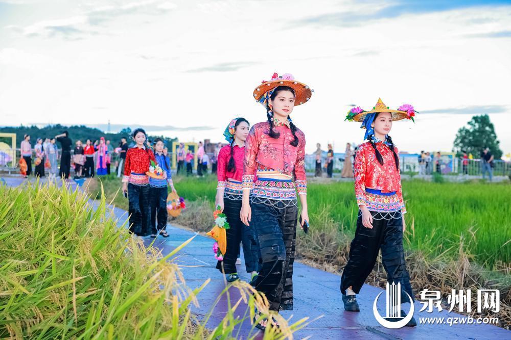 稻田走秀将非遗与时尚、自然与人文联结,艺术融入田园,在最原生态的田野魅力中注入全新的文化内涵。歌舞演出《康定情歌》回响在稻香萦绕的田间——这首全球最具影响力的十首民歌之一,正是诞生于惠安之子吴文季先生的笔下。