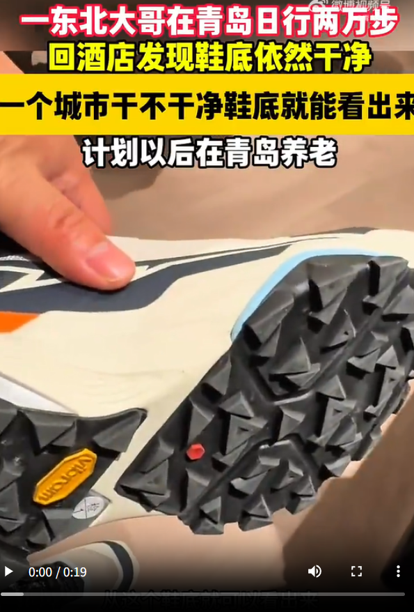 一东北网友在青岛旅游,每天步行两万多步,之后发现鞋底依旧洁净如新。网友表示,青岛这个城市真的很干净,将来计划来青岛养老。