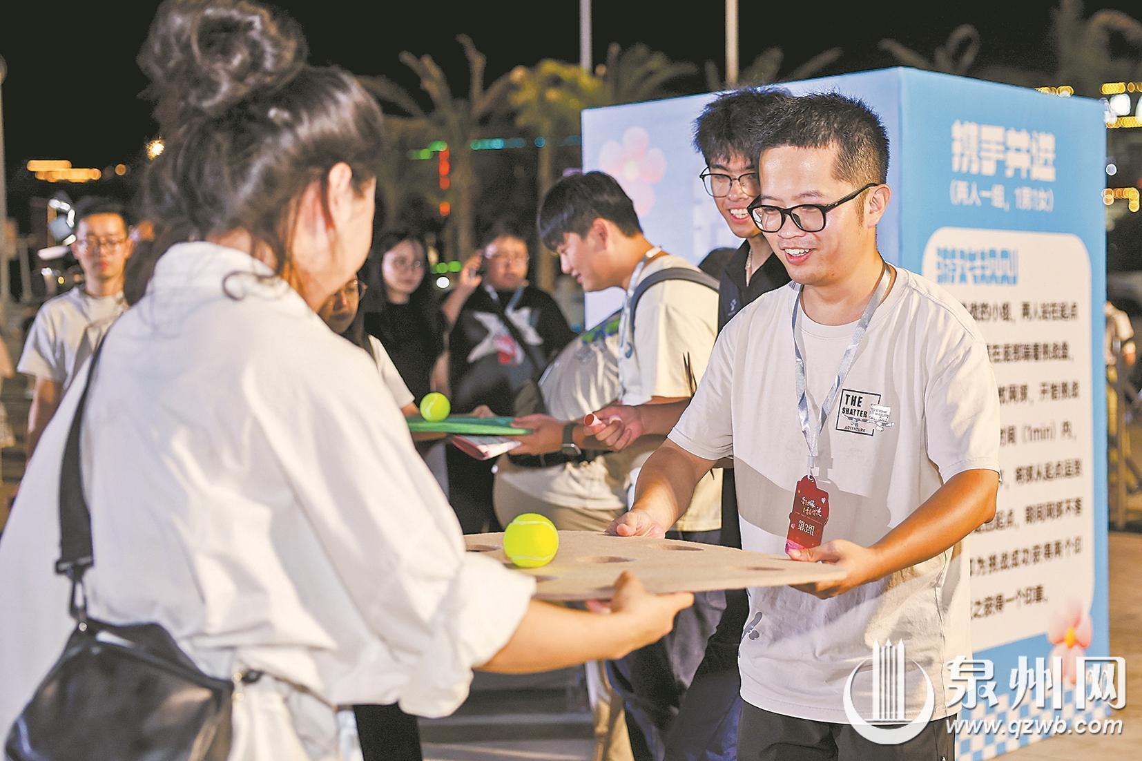 活动现场,融现代与传统为一体的游戏环节引发青年浓厚兴趣。“趣味九宫格”“携手并进”“与你共舞”“情投意合”等互动游戏帮助青年迅速拉近距离;簪花围、猜灯谜等民俗体验则让青年感受泉州传统文化魅力。在集体创作部分,参加活动的青年以彩球拼成“爱在泉州”画面,展现默契与创意,并制作创意箱鼓,经过分声部练习后,共同奏响青春主题曲目。现场还设立“城市福利站”为青年提供咨询服务。