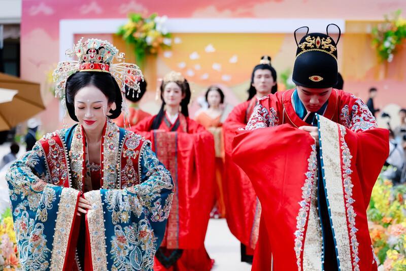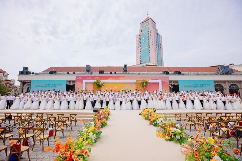 活动现场,一场跨越千年的婚服秀徐徐展开,生动演绎了中华民族婚服文化的审美流变。100对来自世界各地的恋人和夫妻代表齐聚青岛,穿上婚纱,重温婚礼誓言,并分享了他们与青岛结缘的动人爱情故事。活动从全球招募的婚龄1-50周年的夫妻中邀请了50对夫妻亲临现场,分享金婚银婚的伉俪情深;同时邀请了50对年轻恋人和七夕登记新人分享结缘青岛的故事。其中一对来自俄罗斯的夫妇幸福地表示:“青岛的碧海蓝天为我们见证了最美好的时光。今天能在这里接受大家的祝福,感受到这份跨越国界的温暖,让我们倍感幸福。”