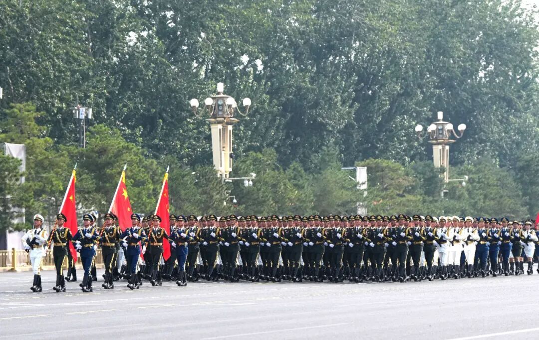 仪仗方队护卫党旗、国旗、军旗,3日上午第一个走过天安门广场,接受祖国和人民检阅。